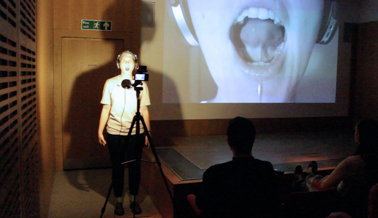 The performer’s mouth is held wide open; jaw, head and lips lock in position. The tongue moves following the words of the script (an audio recording plays directly into the performer’s headphones). The jaw and lips remain still, the tongue’s choreography isolated.