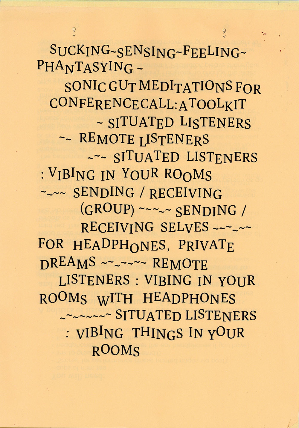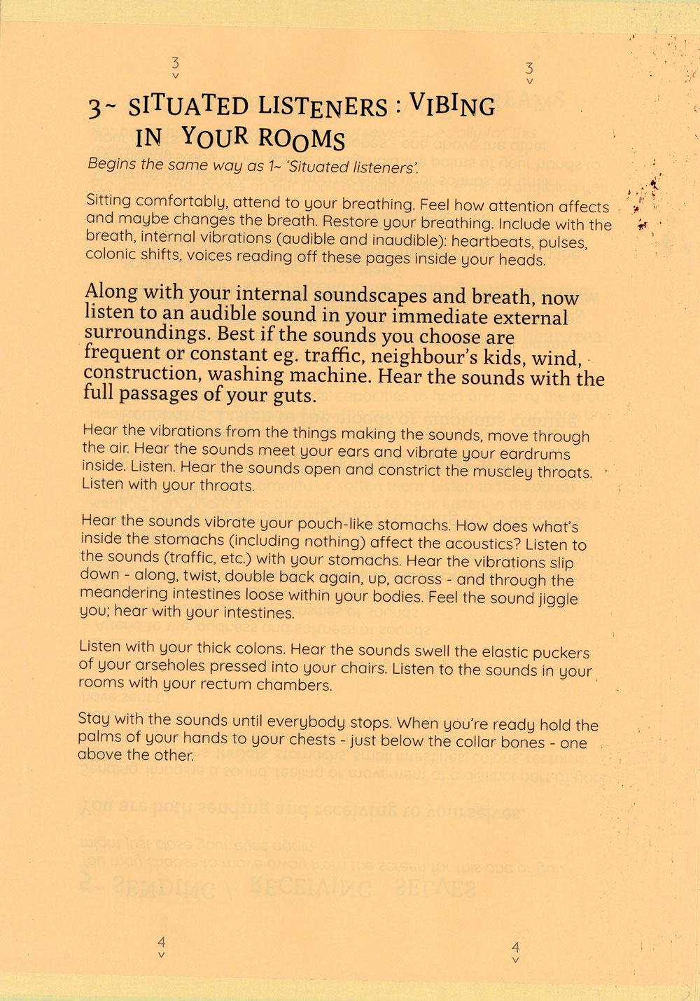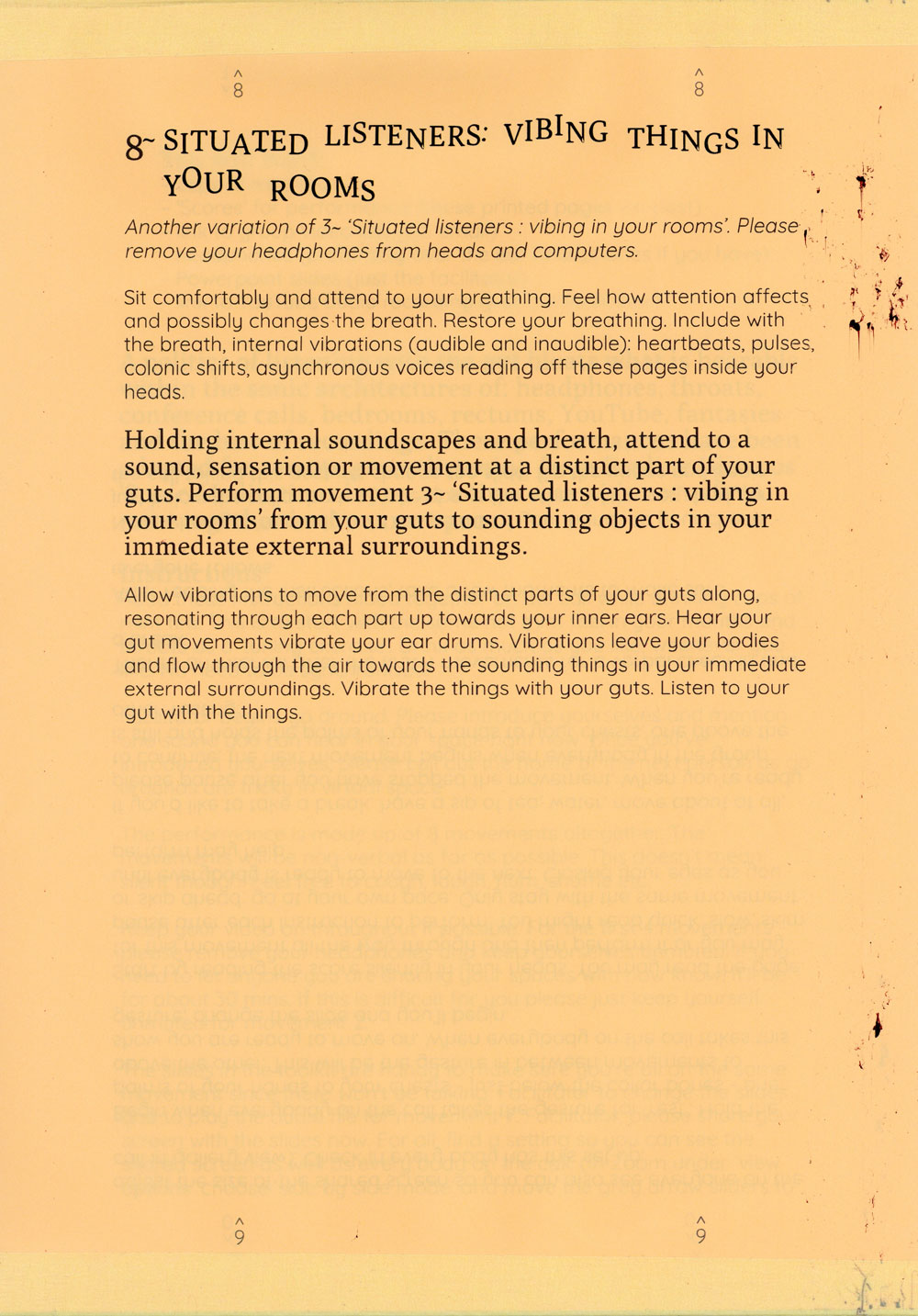 The exercises attempt to expand what is allowed to be heard on a group call and proposes the idea of listening with the whole body, especially with the gut as a psychic organ. A politics of listening with the gut bloats what is hearable within the sonic architectures of headphones, throats, zoom calls, bedrooms, rectums, Vimeo, fantasies and the hiss of recordings.