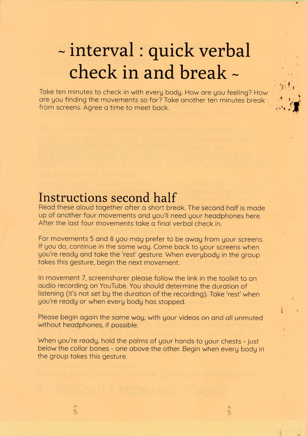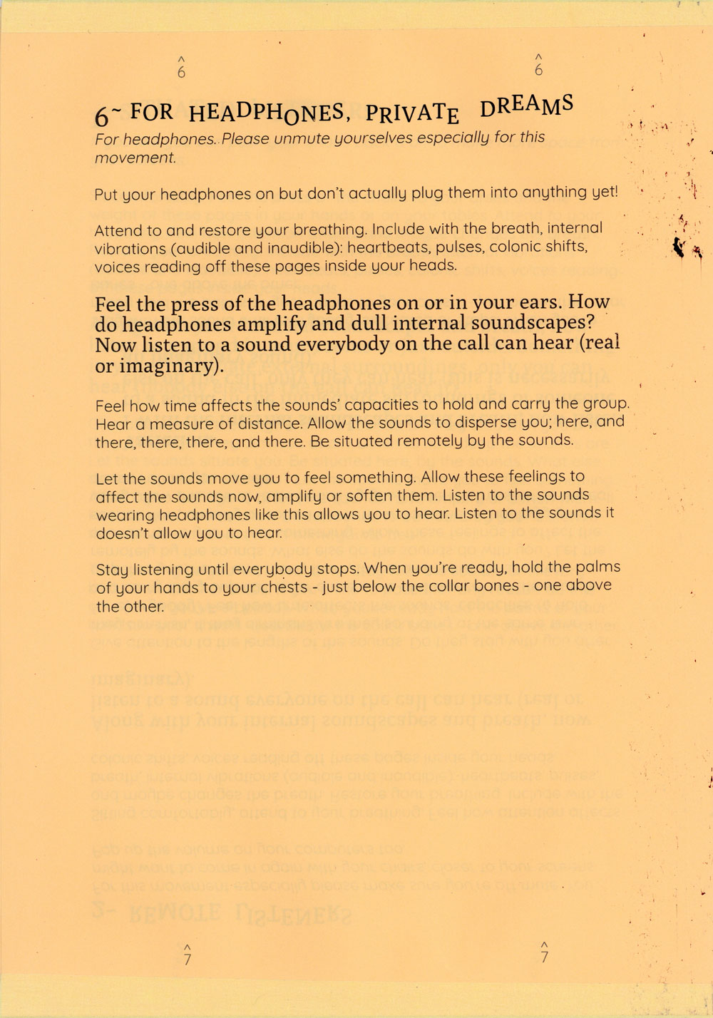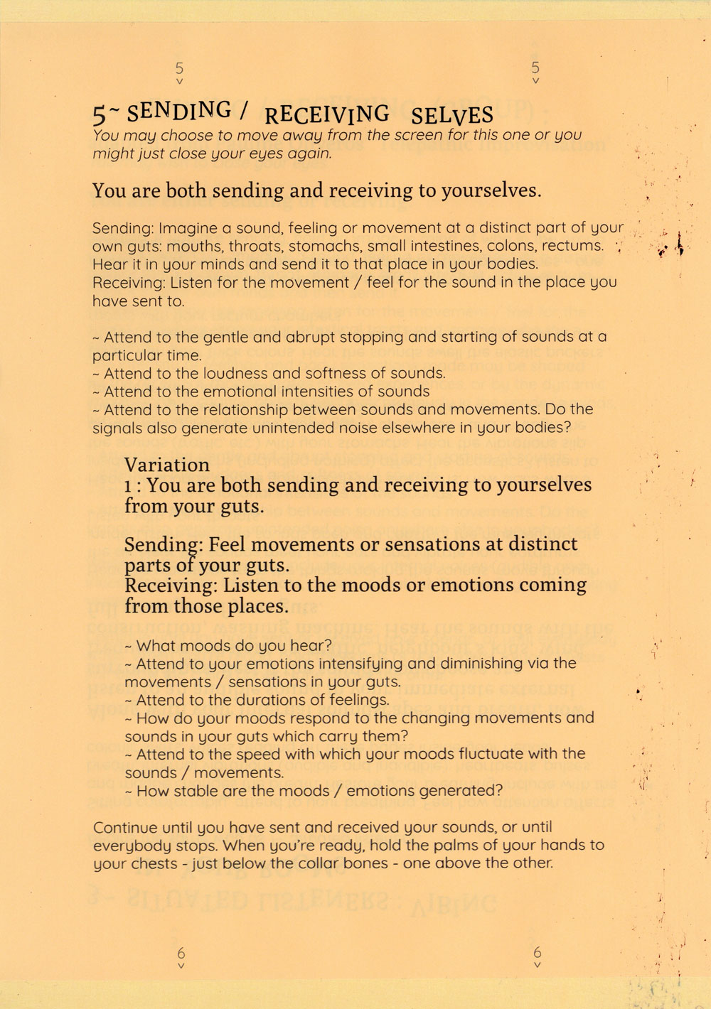 The exercises attempt to expand what is allowed to be heard on a group call and proposes the idea of listening with the whole body, especially with the gut as a psychic organ. A politics of listening with the gut bloats what is hearable within the sonic architectures of headphones, throats, zoom calls, bedrooms, rectums, Vimeo, fantasies and the hiss of recordings.