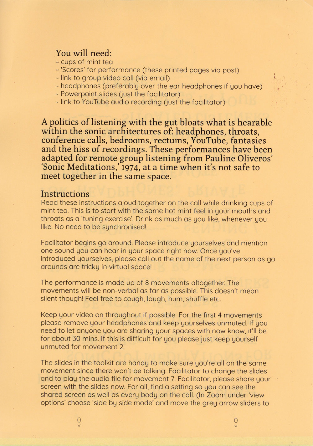Sonic Gut Meditations for Conference Call, is a workshop in which participants come together to try out eight group listening exercises that are loosely based on composer Pauline Oliveros’ Sonic Meditations (1974), and adapted for video call at a time when it’s not safe to meet together in a room.