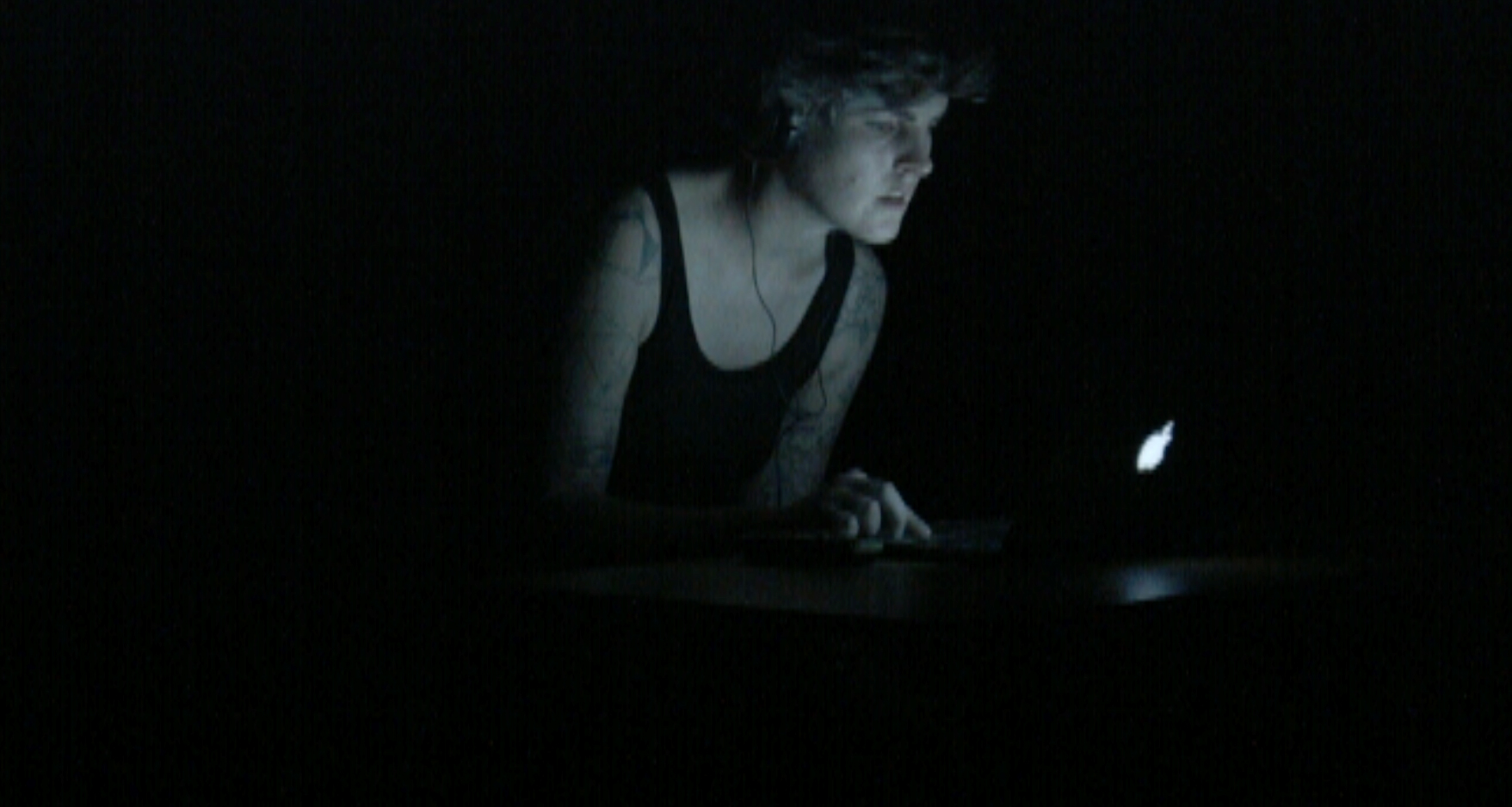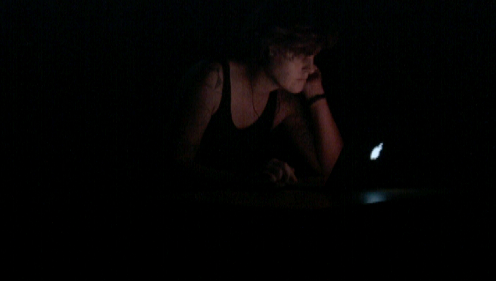 A durational video of white animated text on a black background plays on the cinema screen. The audience read together silently. The performer sits in front of the screen; her face is lit up by a laptop. The screenglare on her face changes colour and intensity – green, white, pink – choreographed by the minimal sounds of scrolling and double clicking.