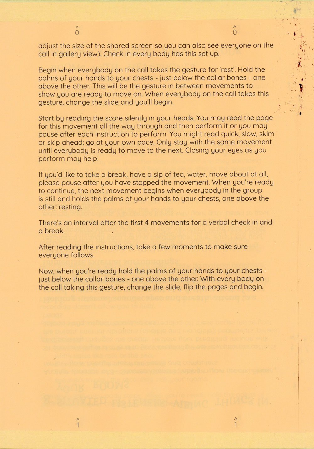 Sonic Gut Meditations for Conference Call, is a workshop in which participants come together to try out eight group listening exercises that are loosely based on composer Pauline Oliveros’ Sonic Meditations (1974), and adapted for video call at a time when it’s not safe to meet together in a room.