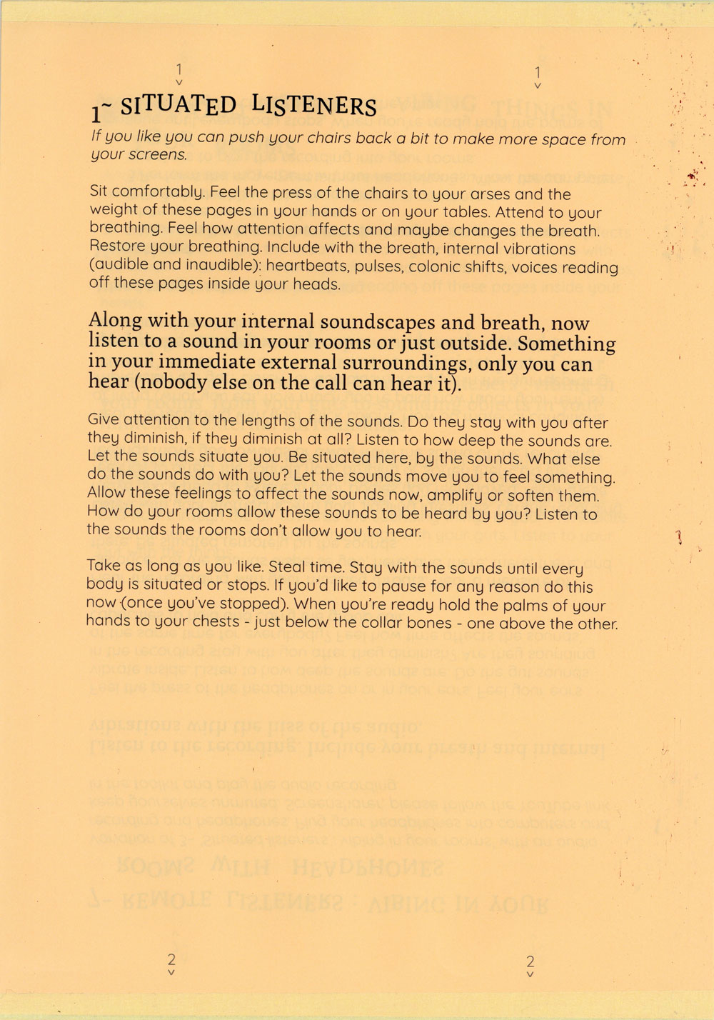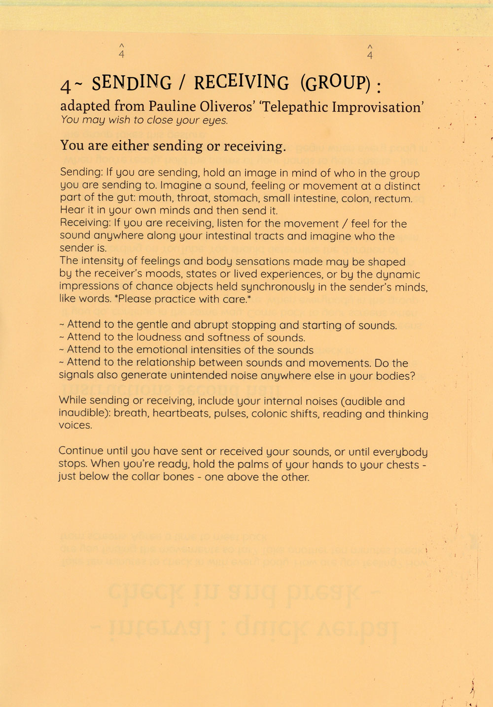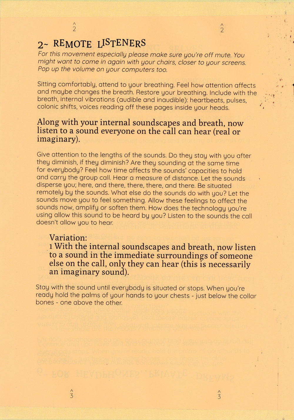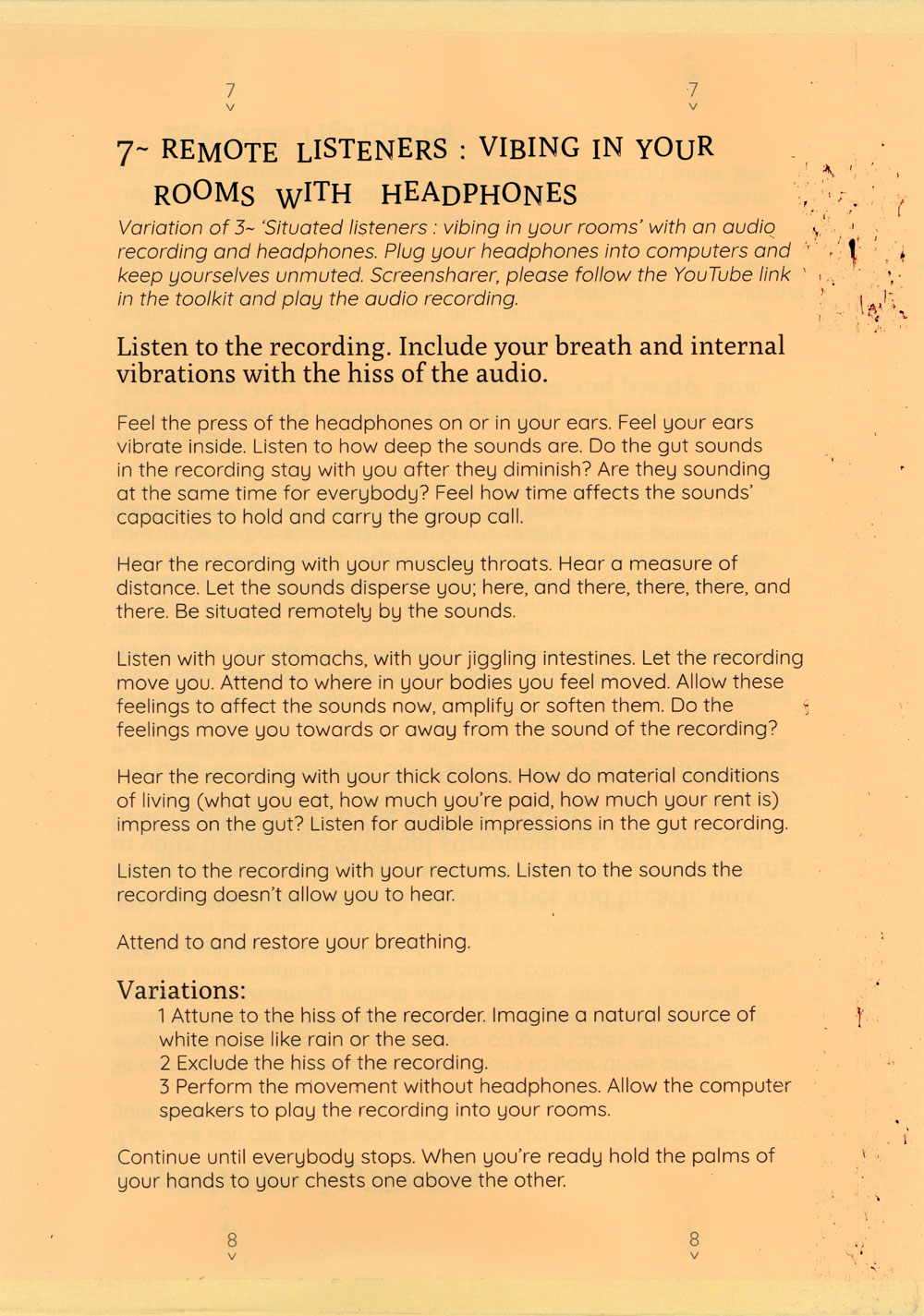 The exercises attempt to expand what is allowed to be heard on a group call and proposes the idea of listening with the whole body, especially with the gut as a psychic organ. A politics of listening with the gut bloats what is hearable within the sonic architectures of headphones, throats, zoom calls, bedrooms, rectums, Vimeo, fantasies and the hiss of recordings.